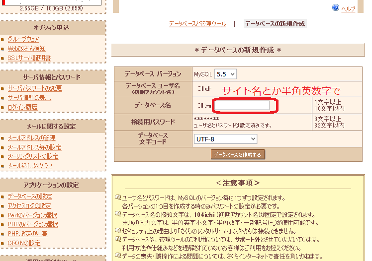 データベース名は、先程のフォルダと同様にこれから作るサイト名など分かりやすい名前を半角英数字で付けましょう。