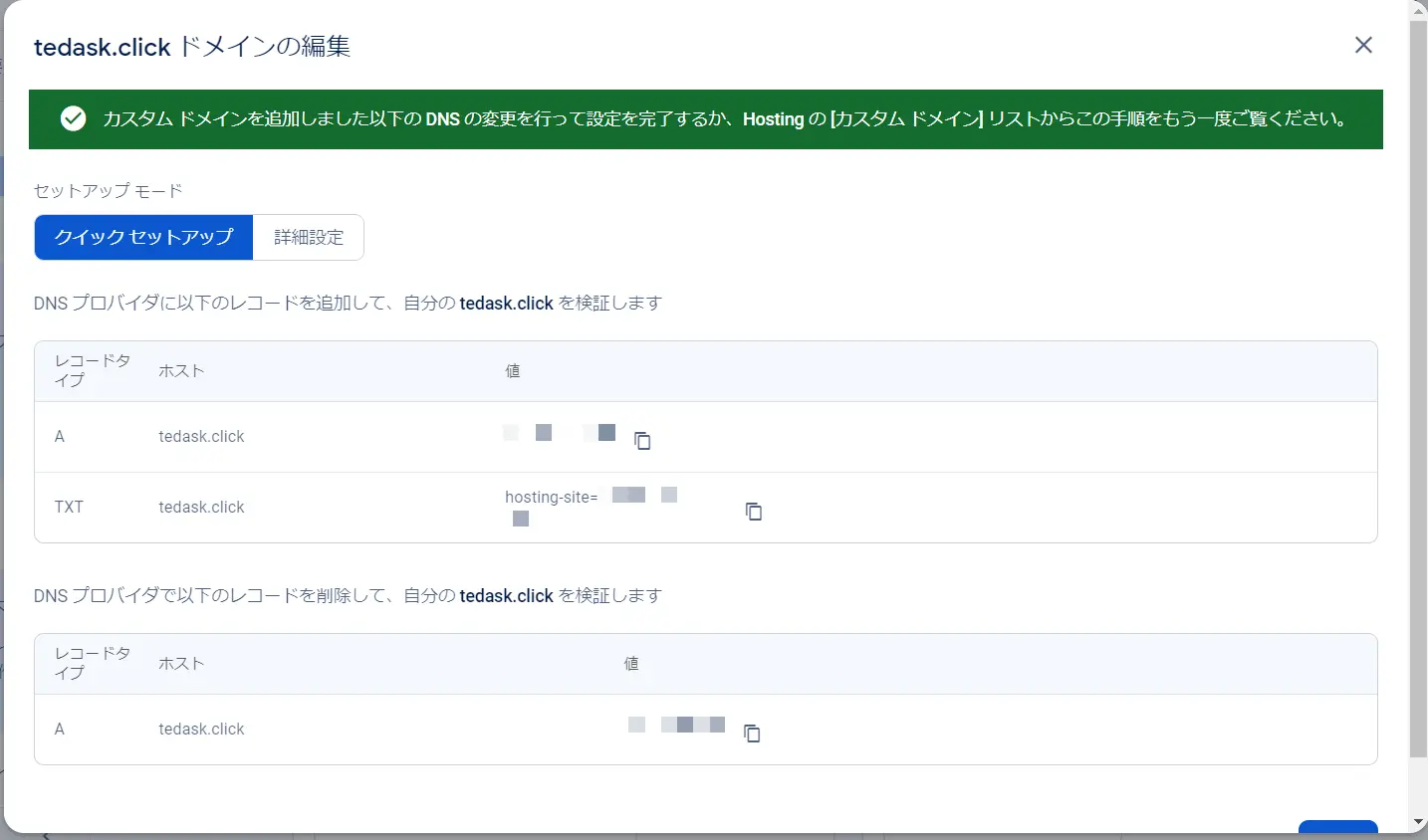 入力欄が表示されたら、DNSレコードを入力していきますが、この内容は先程FirebaseのHostingで表示されていた値を入力します。
